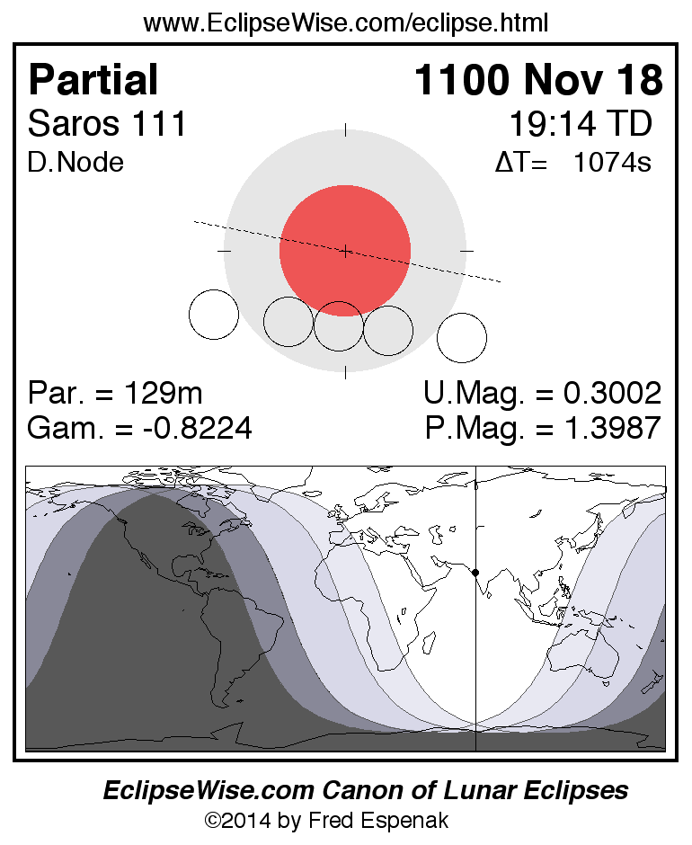 The partial lunar eclipse of 1100 Nov 18 is preceded two weeks earlier by a total solar eclipse on 1100 Nov 03.