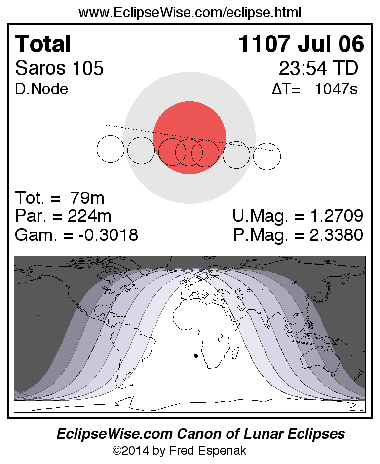 The instant of greatest eclipse takes place on 1107 Jul 06 at 23:54:06 TD (23:36:39 UT1).