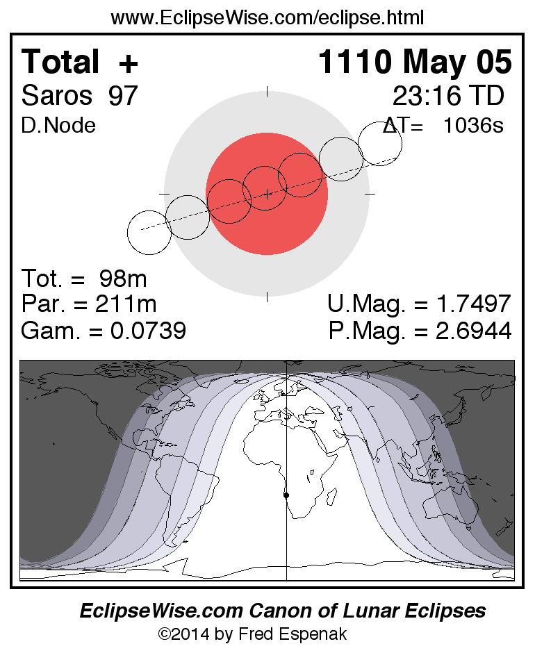 The total lunar eclipse of 1110 May 05 is preceded two weeks earlier by a partial solar eclipse on 1110 Apr 20,