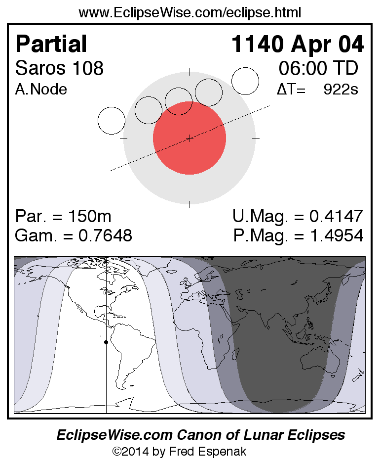 The partial lunar eclipse of 1140 Apr 04 is preceded two weeks earlier by a total solar eclipse on 1140 Mar 20.