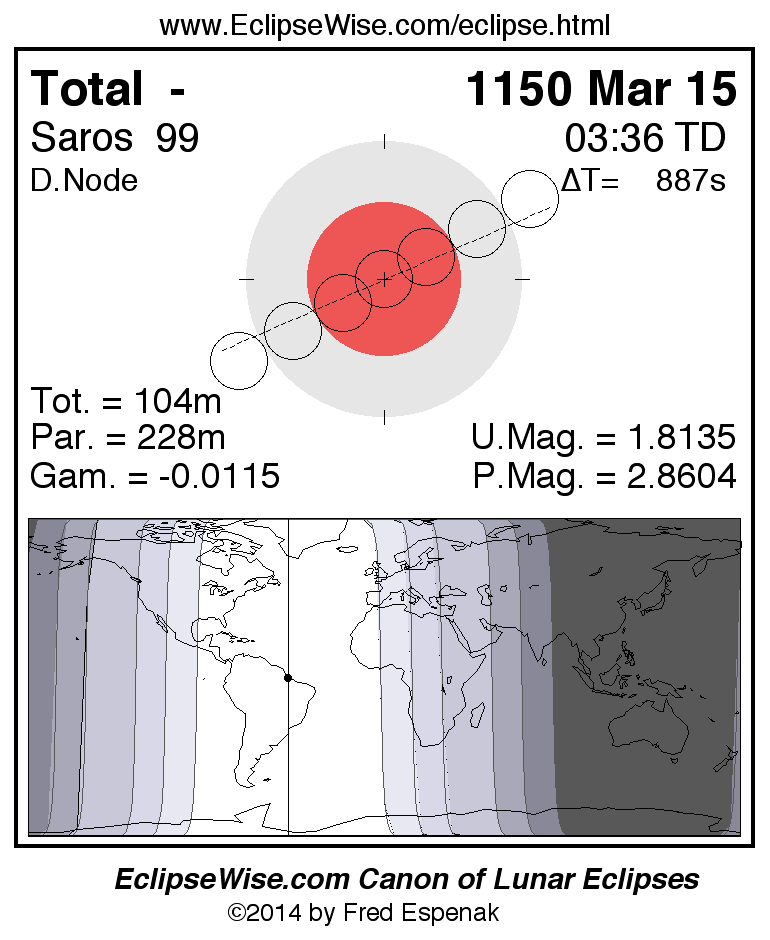 The total lunar eclipse of 1150 Mar 15 is preceded two weeks earlier by a partial solar eclipse on 1150 Mar 01,