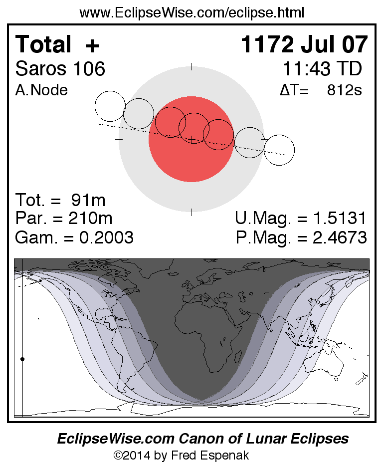 The total lunar eclipse of 1172 Jul 07 is preceded two weeks earlier by a partial solar eclipse on 1172 Jun 23.