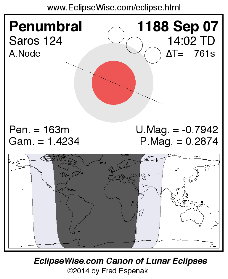 The penumbral lunar eclipse of 1188 Sep 07 is preceded two weeks earlier by a total solar eclipse on 1188 Aug 24.