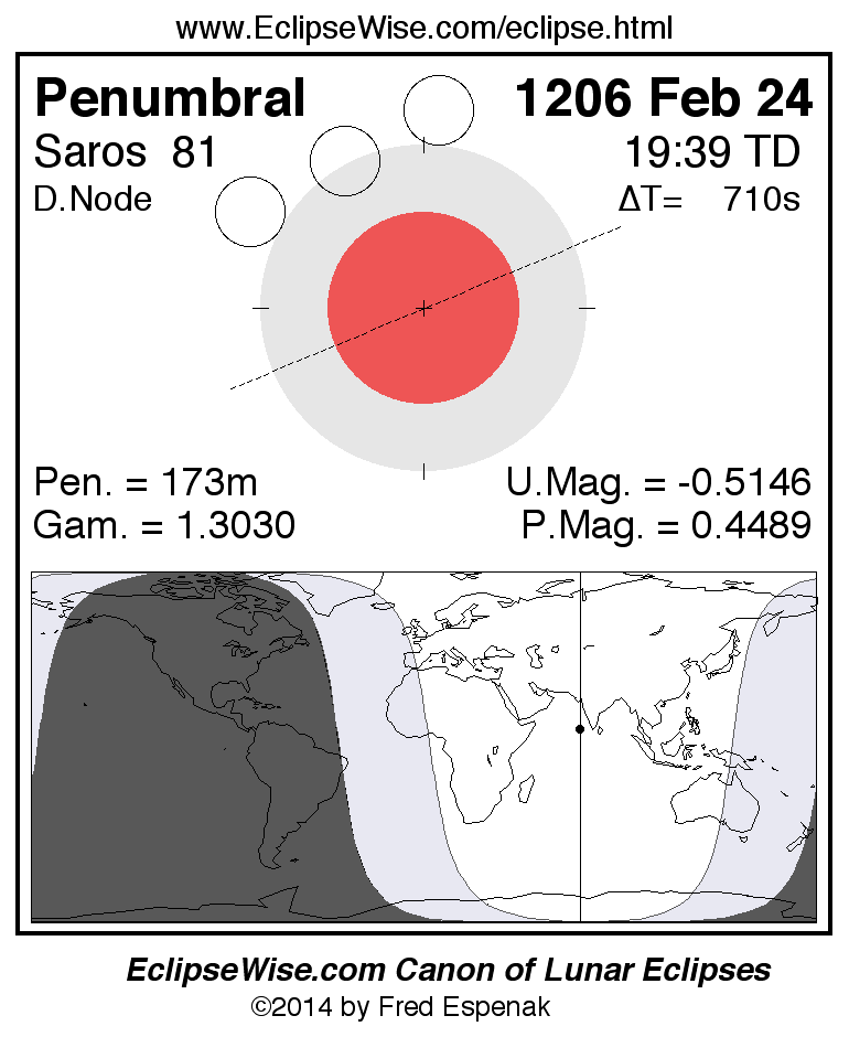 Another lunar eclipse occurs one synodic month after the 1206 Feb 24 eclipse. It is the penumbral lunar eclipse of 1206 Mar 26.