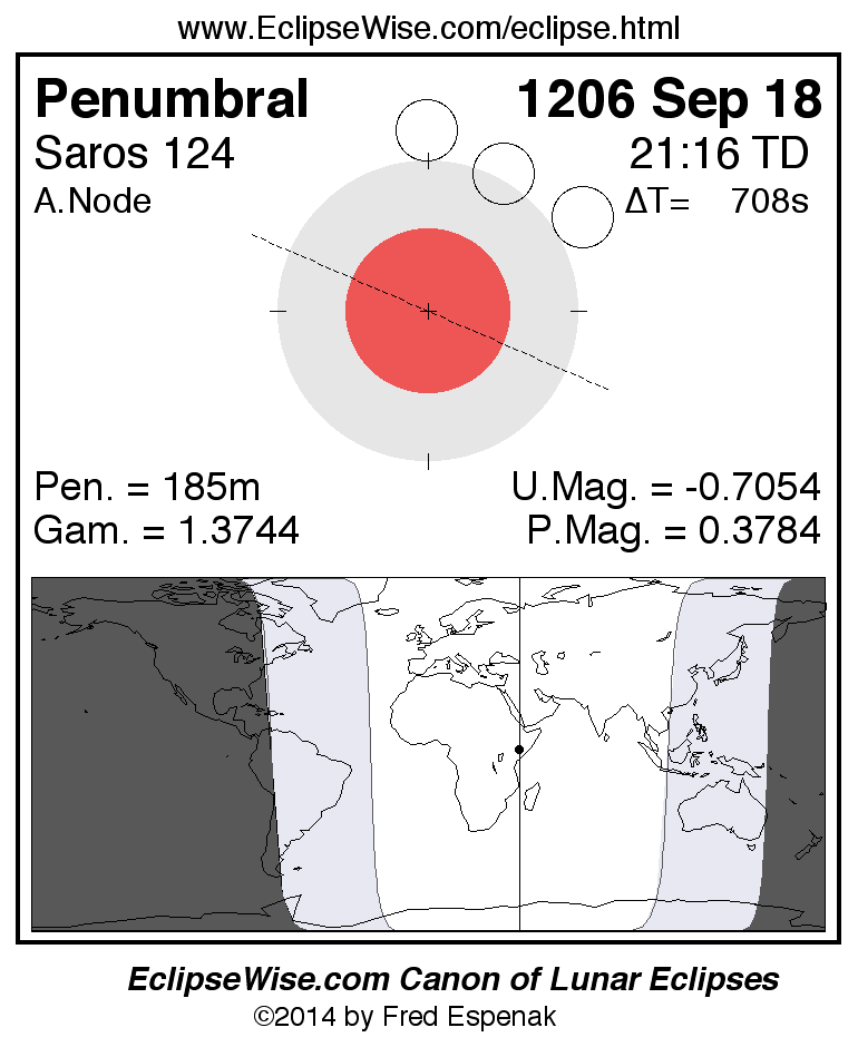 The penumbral lunar eclipse of 1206 Sep 18 is preceded two weeks earlier by a total solar eclipse on 1206 Sep 04.