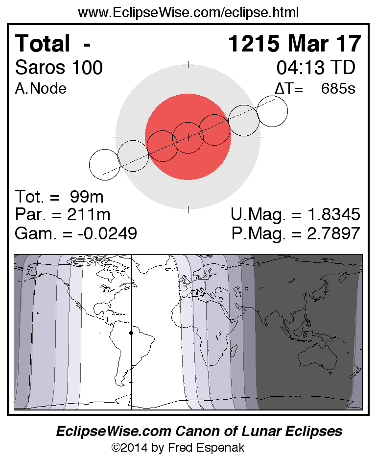 The total lunar eclipse of 1215 Mar 17 is preceded two weeks earlier by a partial solar eclipse on 1215 Mar 02,