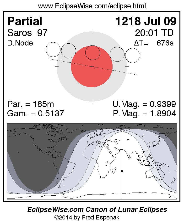 The partial lunar eclipse of 1218 Jul 09 is followed two weeks later by a annular solar eclipse on 1218 Jul 24.