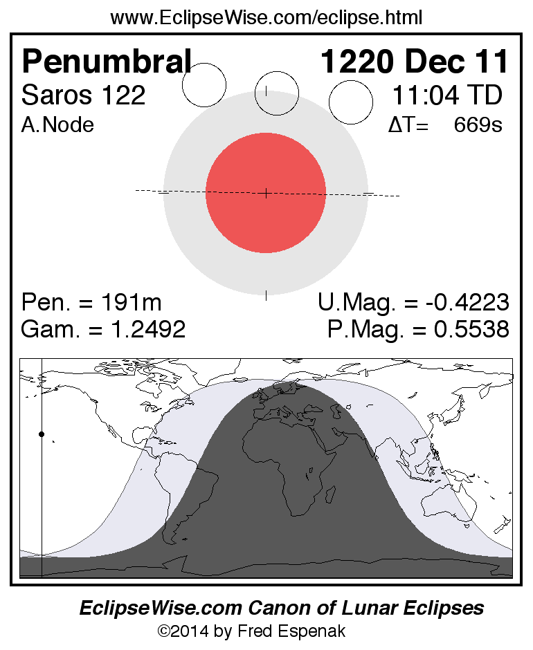 Another lunar eclipse occurs one synodic month before the 1220 Dec 11 eclipse. It is the penumbral lunar eclipse of 1220 Nov 12.