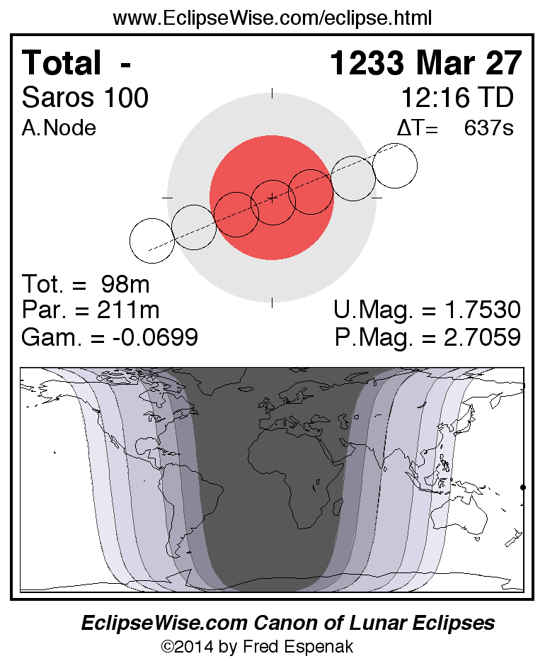 The instant of greatest eclipse takes place on 1233 Mar 27 at 12:15:35 TD (12:04:58 UT1).