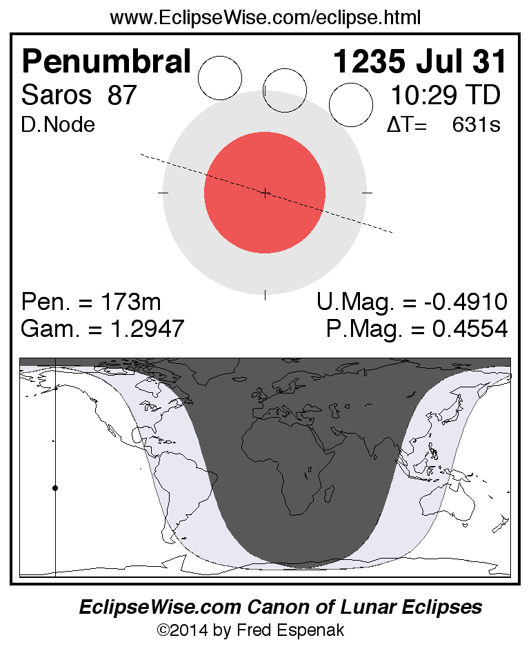 The penumbral lunar eclipse of 1235 Jul 31 is followed two weeks later by a annular solar eclipse on 1235 Aug 15.