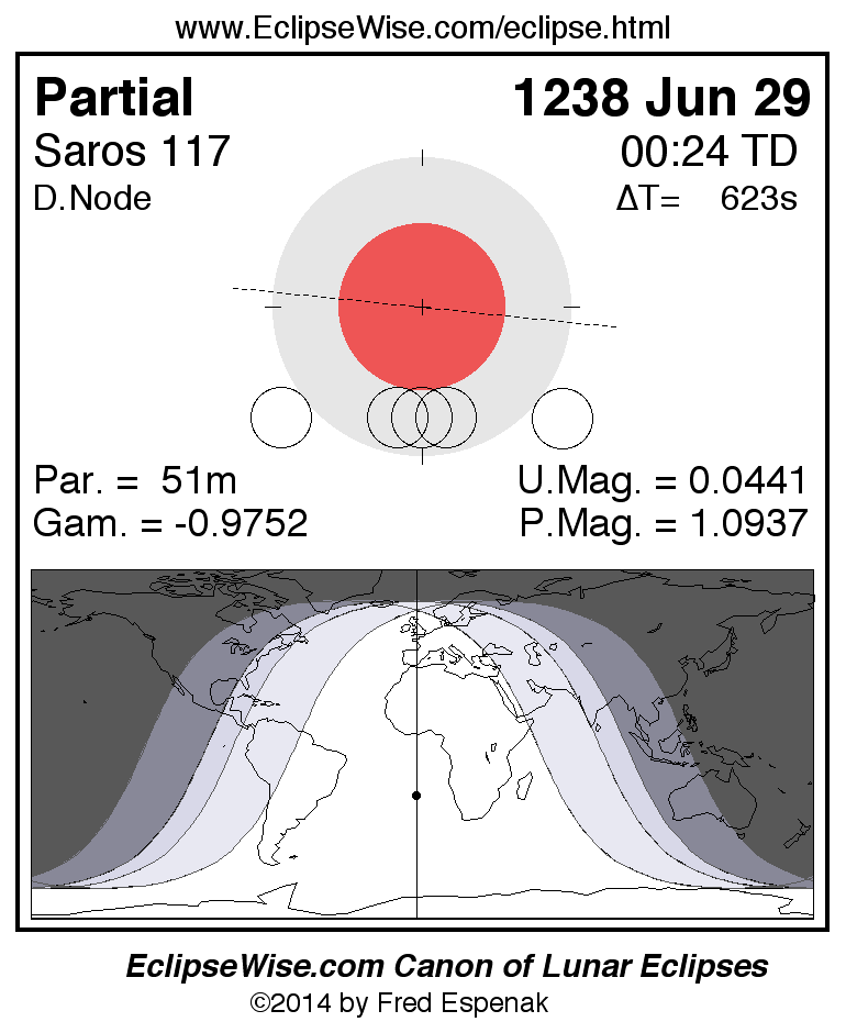 The partial lunar eclipse of 1238 Jun 29 is preceded two weeks earlier by a total solar eclipse on 1238 Jun 13.