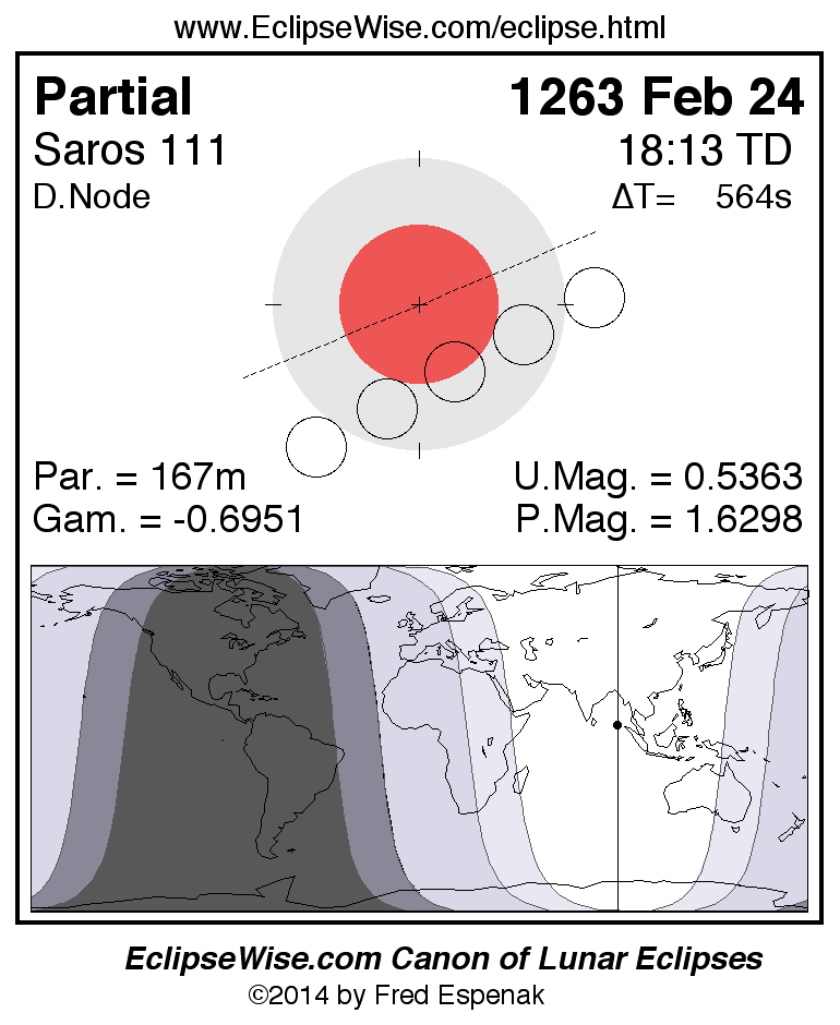 The instant of greatest eclipse takes place on 1263 Feb 24 at 18:12:38 TD (18:03:15 UT1).