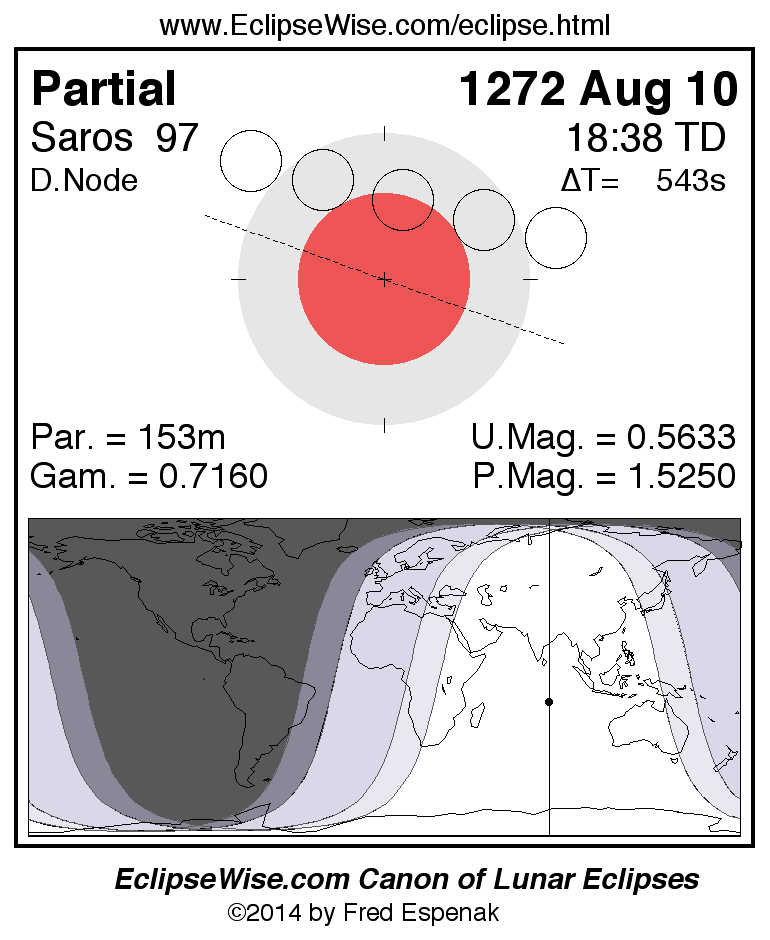 The instant of greatest eclipse takes place on 1272 Aug 10 at 18:37:42 TD (18:28:40 UT1).