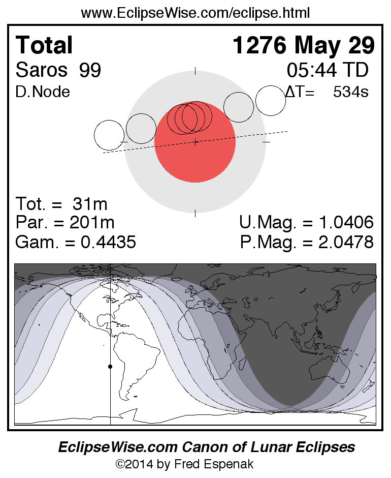 The total lunar eclipse of 1276 May 29 is followed two weeks later by a total solar eclipse on 1276 Jun 13.