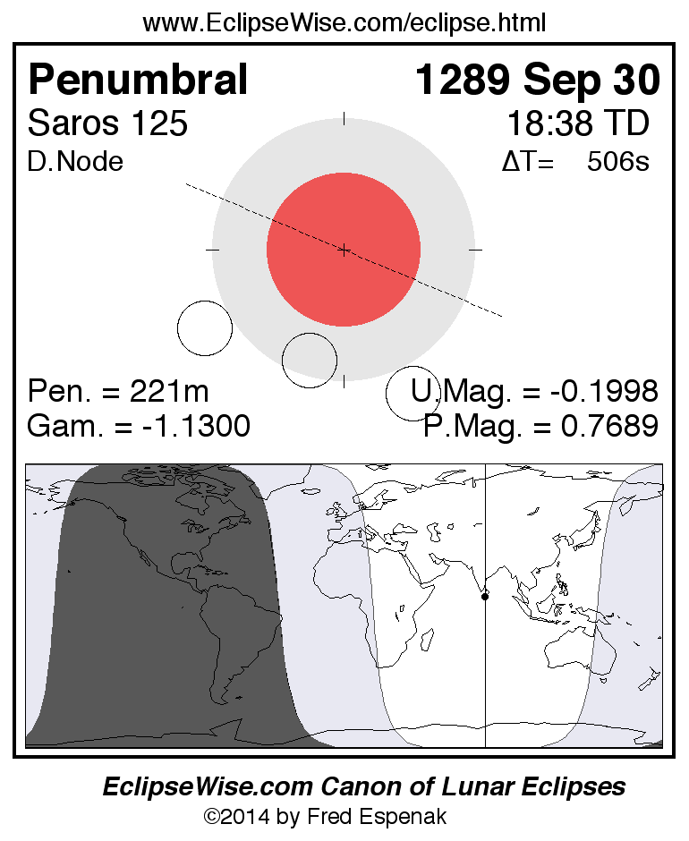 Another lunar eclipse occurs one synodic month before the 1289 Sep 30 eclipse. It is the penumbral lunar eclipse of 1289 Sep 01.