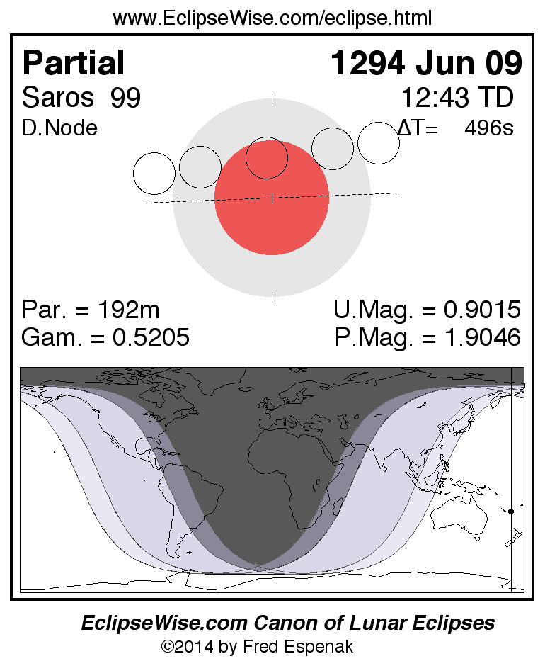 The instant of greatest eclipse takes place on 1294 Jun 09 at 12:43:28 TD (12:35:11 UT1).