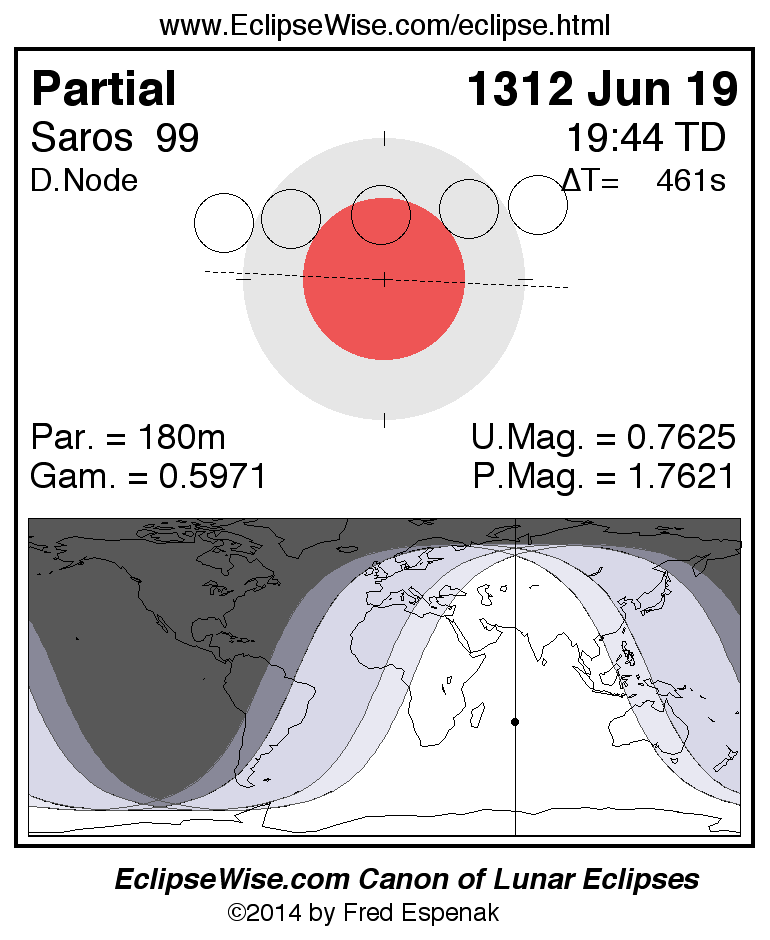 The instant of greatest eclipse takes place on 1312 Jun 19 at 19:43:42 TD (19:36:02 UT1).