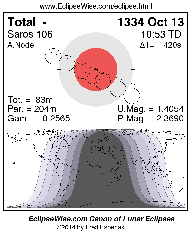 The total lunar eclipse of 1334 Oct 13 is followed two weeks later by a partial solar eclipse on 1334 Oct 28.