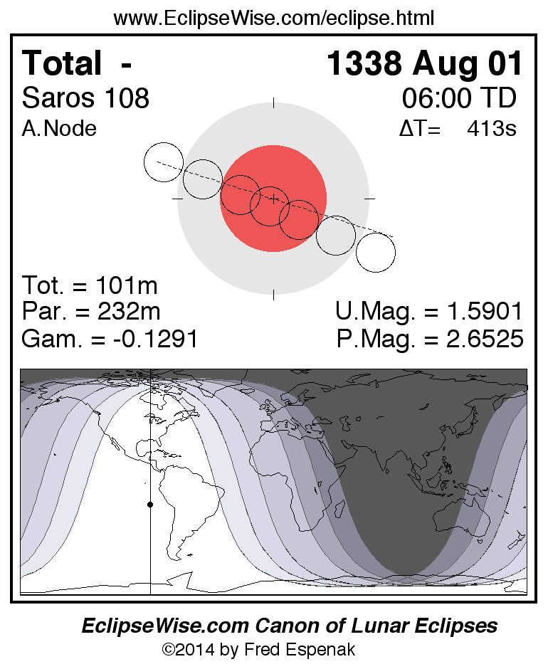 The total lunar eclipse of 1338 Aug 01 is preceded two weeks earlier by a partial solar eclipse on 1338 Jul 18,