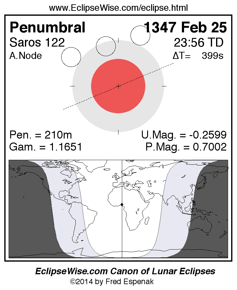 Another lunar eclipse occurs one synodic month before the 1347 Feb 25 eclipse. It is the penumbral lunar eclipse of 1347 Jan 27.