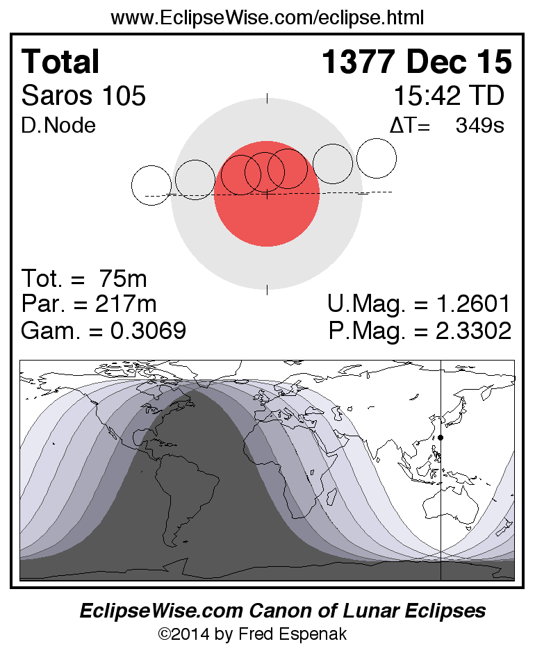The instant of greatest eclipse takes place on 1377 Dec 15 at 15:42:18 TD (15:36:28 UT1).