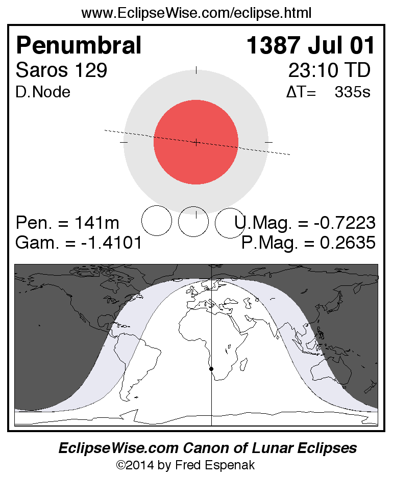 Another lunar eclipse occurs one synodic month before the 1387 Jul 01 eclipse. It is the penumbral lunar eclipse of 1387 Jun 02.