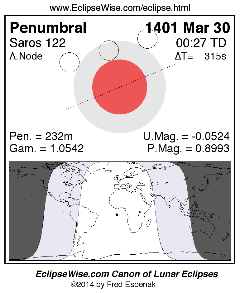 Another lunar eclipse occurs one synodic month before the 1401 Mar 30 eclipse. It is the penumbral lunar eclipse of 1401 Feb 28.