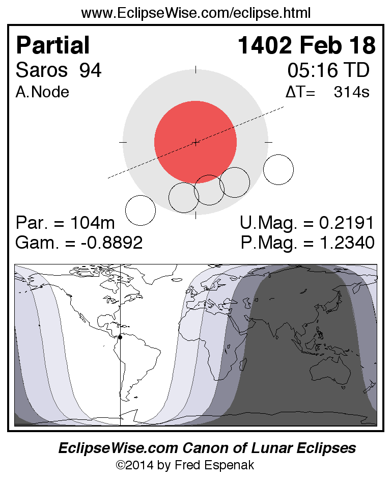 The instant of greatest eclipse takes place on 1402 Feb 18 at 05:16:27 TD (05:11:13 UT1).