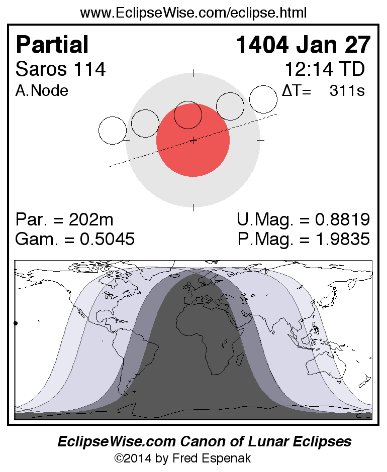 The instant of greatest eclipse takes place on 1404 Jan 27 at 12:13:41 TD (12:08:29 UT1).
