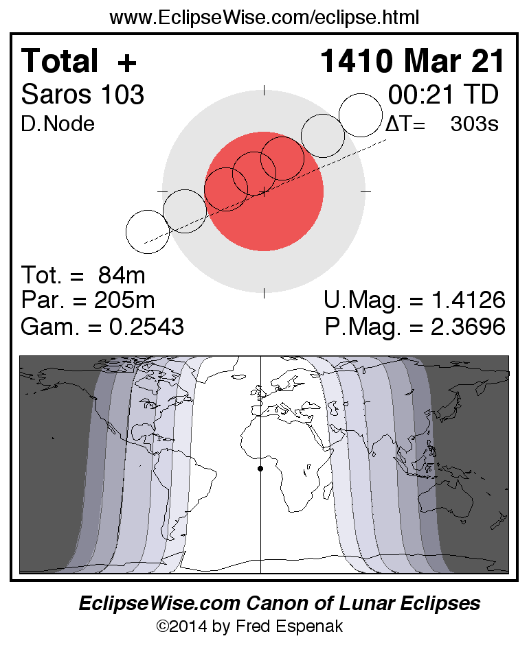 The instant of greatest eclipse takes place on 1410 Mar 21 at 00:20:43 TD (00:15:40 UT1).