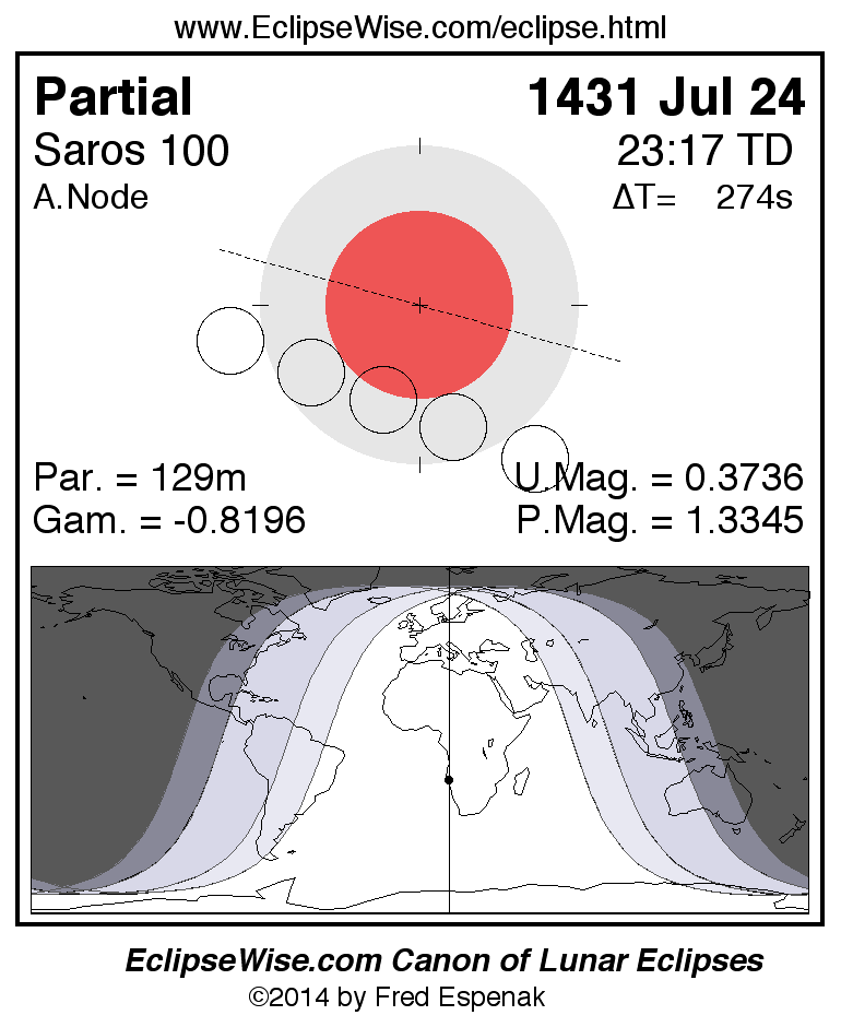 The instant of greatest eclipse takes place on 1431 Jul 24 at 23:16:40 TD (23:12:06 UT1).