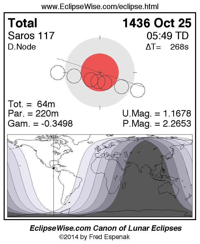 The total lunar eclipse of 1436 Oct 25 is preceded two weeks earlier by a partial solar eclipse on 1436 Oct 10.