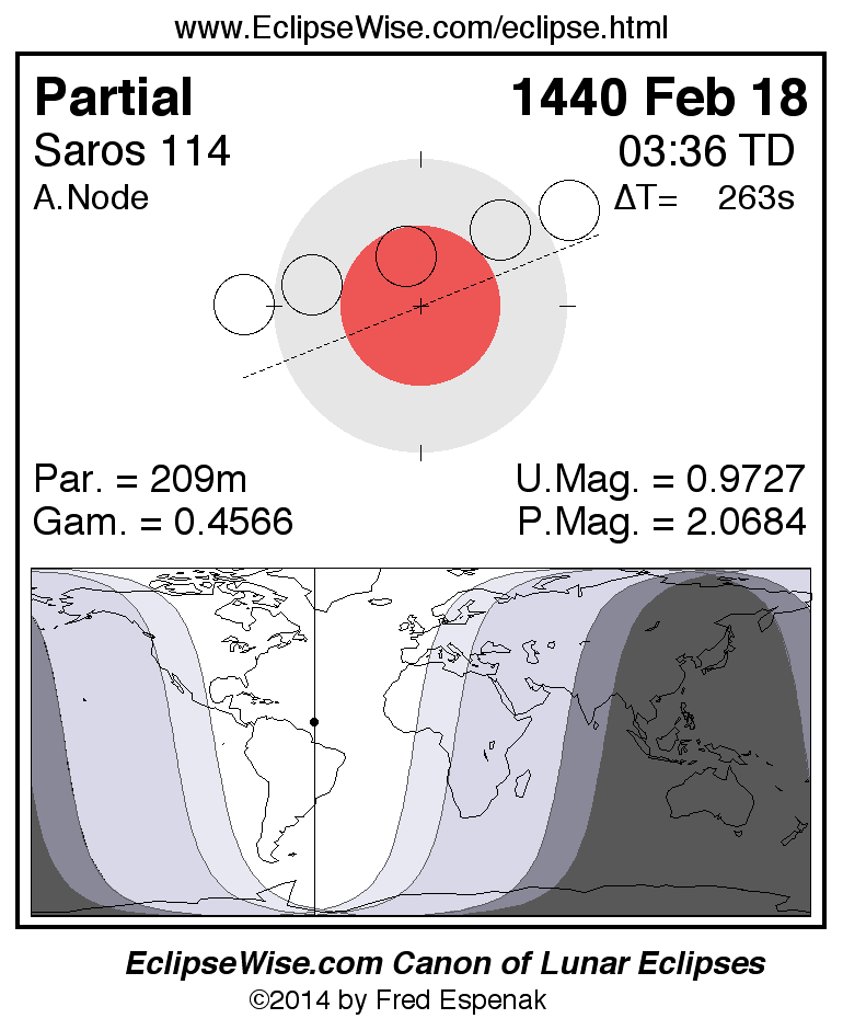 The instant of greatest eclipse takes place on 1440 Feb 18 at 03:35:30 TD (03:31:07 UT1).