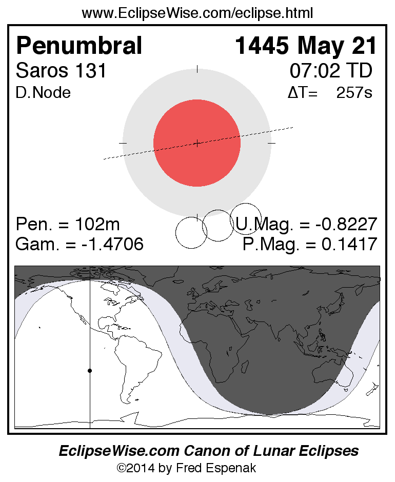 Another lunar eclipse occurs one synodic month before the 1445 May 21 eclipse. It is the penumbral lunar eclipse of 1445 Apr 21.