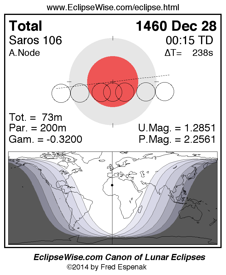 The instant of greatest eclipse takes place on 1460 Dec 28 at 00:14:43 TD (00:10:45 UT1).