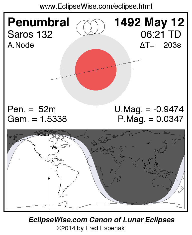 Another lunar eclipse occurs one synodic month before the 1492 May 12 eclipse. It is the penumbral lunar eclipse of 1492 Apr 12.