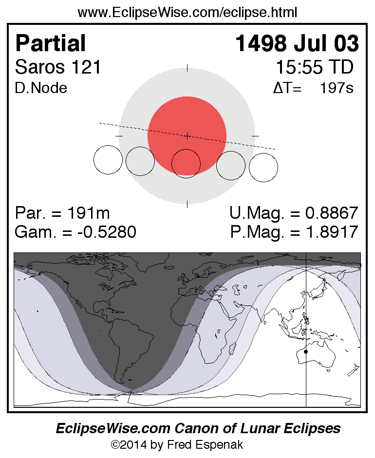 The instant of greatest eclipse takes place on 1498 Jul 03 at 15:54:46 TD (15:51:29 UT1).