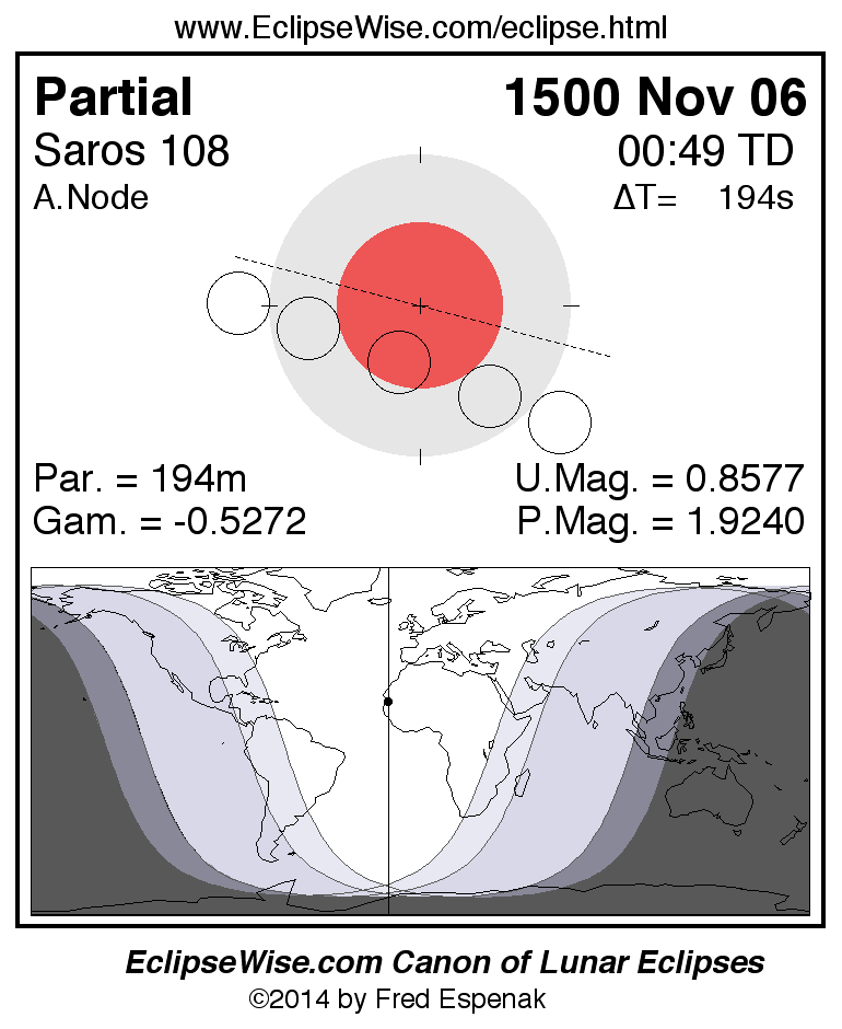 The instant of greatest eclipse takes place on 1500 Nov 06 at 00:48:32 TD (00:45:17 UT1).
