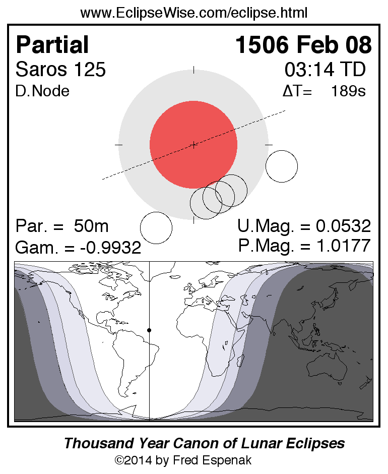 The instant of greatest eclipse takes place on 1506 Feb 08 at 03:14:05 TD (03:10:56 UT1).