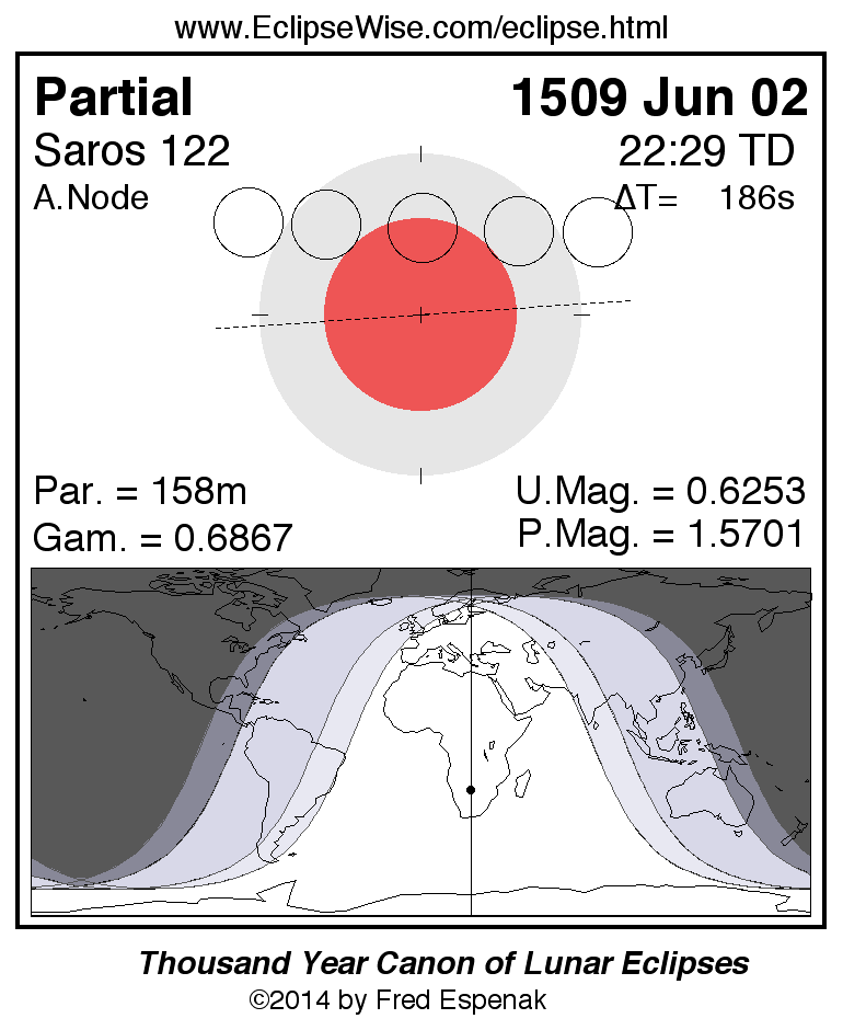 The instant of greatest eclipse takes place on 1509 Jun 02 at 22:29:16 TD (22:26:11 UT1).