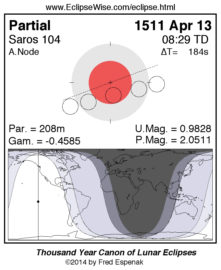 The partial lunar eclipse of 1511 Apr 13 is followed two weeks later by a total solar eclipse on 1511 Apr 27.