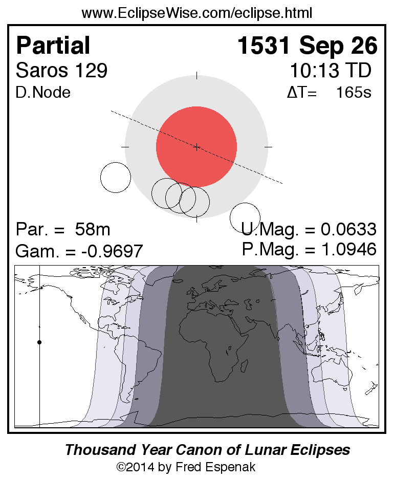 The partial lunar eclipse of 1531 Sep 26 is preceded two weeks earlier by a total solar eclipse on 1531 Sep 10.