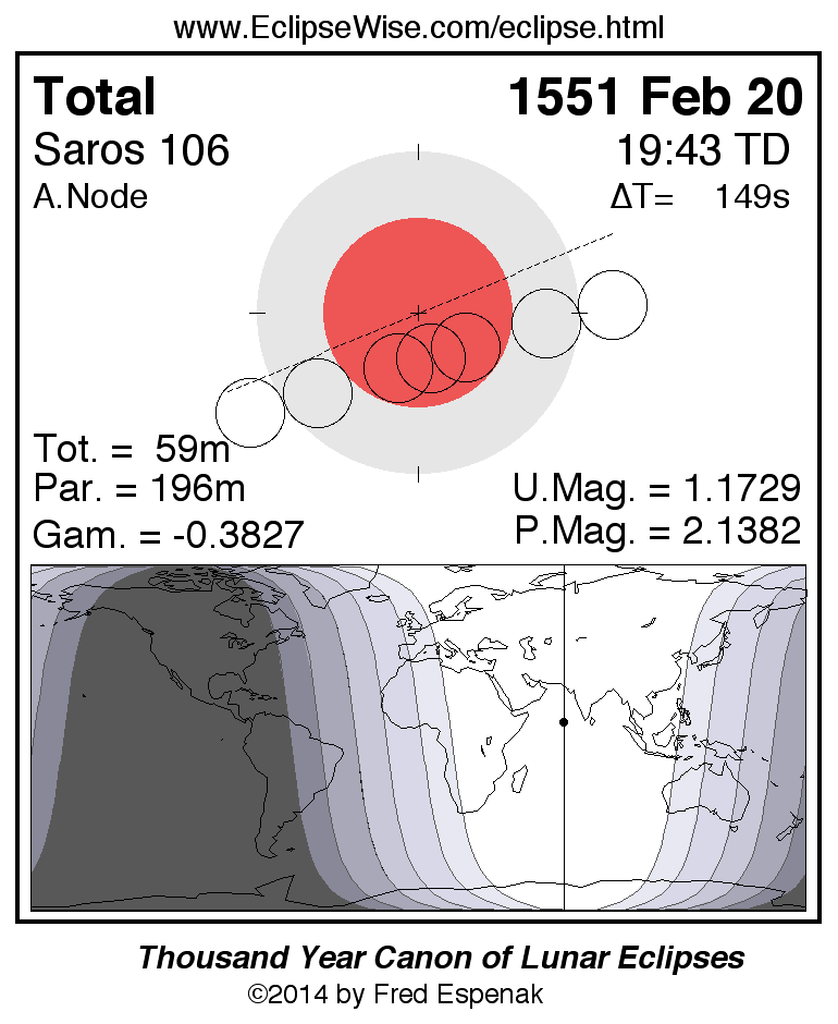 The instant of greatest eclipse takes place on 1551 Feb 20 at 19:43:10 TD (19:40:42 UT1).