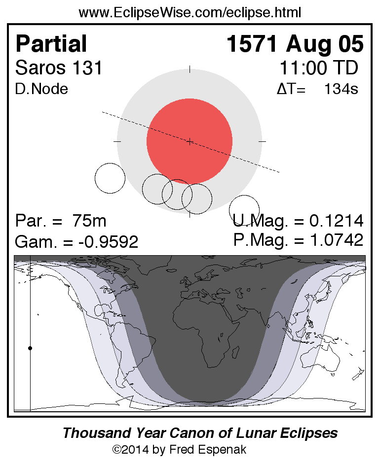 The instant of greatest eclipse takes place on 1571 Aug 05 at 10:59:41 TD (10:57:27 UT1).