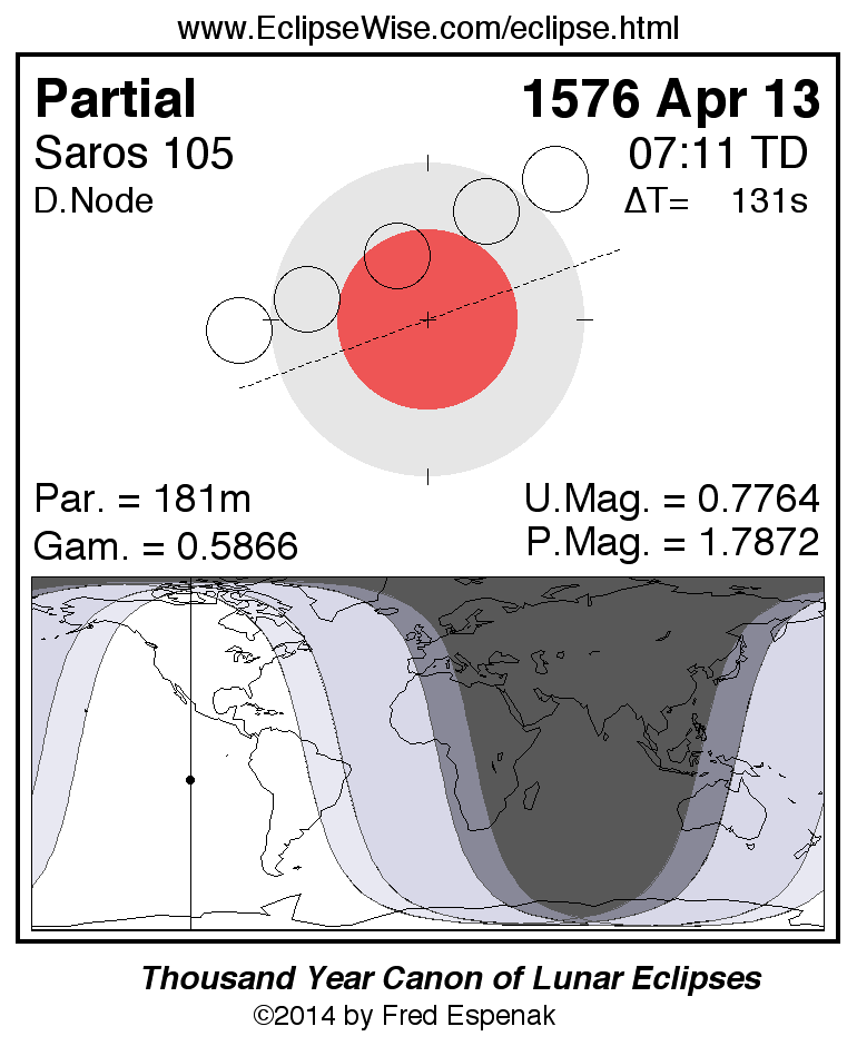 The partial lunar eclipse of 1576 Apr 13 is followed two weeks later by a total solar eclipse on 1576 Apr 28.