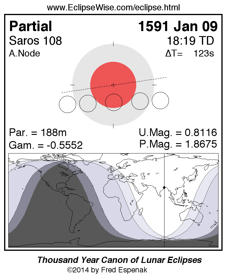 The instant of greatest eclipse takes place on 1591 Jan 09 at 18:19:20 TD (18:17:18 UT1).