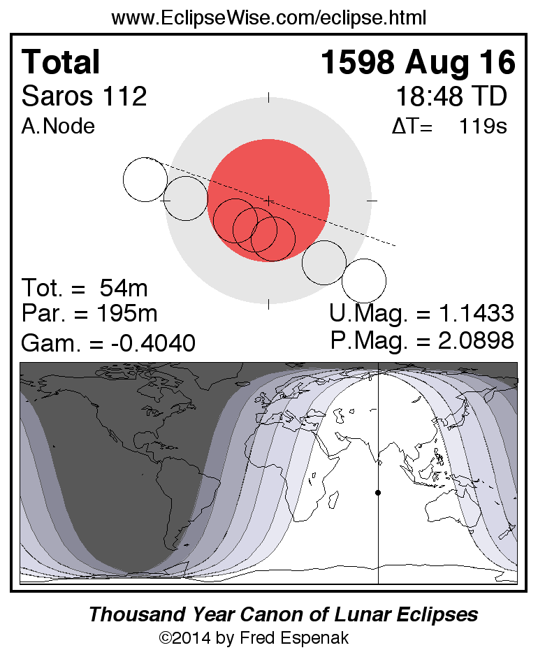 The total lunar eclipse of 1598 Aug 16 is followed two weeks later by a annular solar eclipse on 1598 Aug 31.