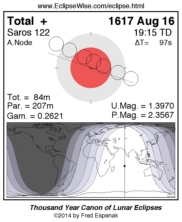 The total lunar eclipse of 1617 Aug 16 is preceded two weeks earlier by a partial solar eclipse on 1617 Aug 01.