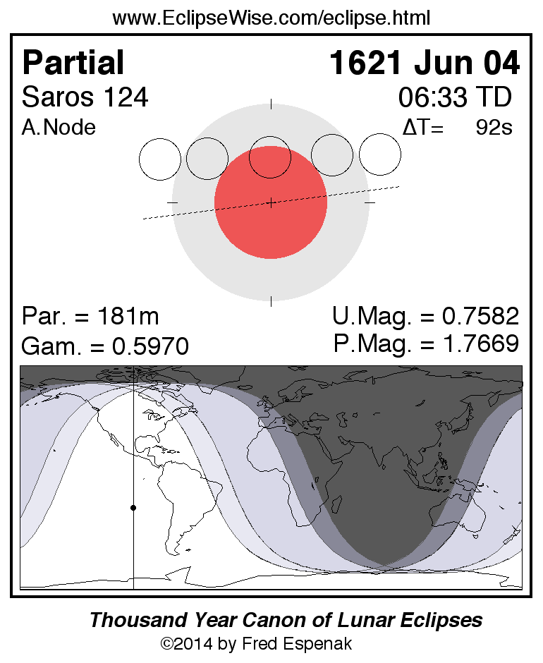 The instant of greatest eclipse takes place on 1621 Jun 04 at 06:32:44 TD (06:31:12 UT1).
