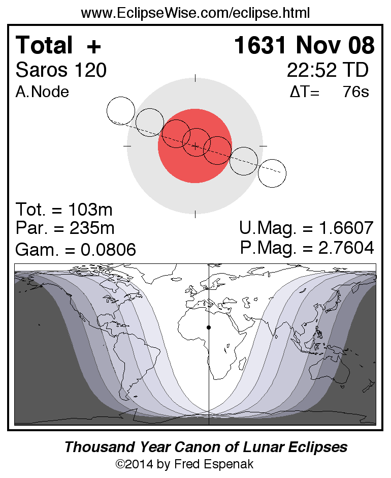 The instant of greatest eclipse takes place on 1631 Nov 08 at 22:51:37 TD (22:50:21 UT1).